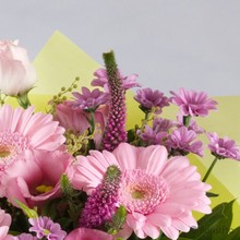 A pretty handtied bouquet of mixed pink flowers and foliage
