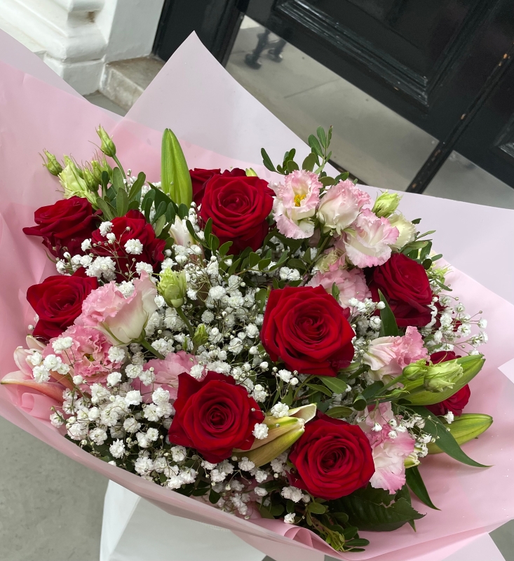 Mixed bouquet with red roses, lilies, lisianthus & gypsophila