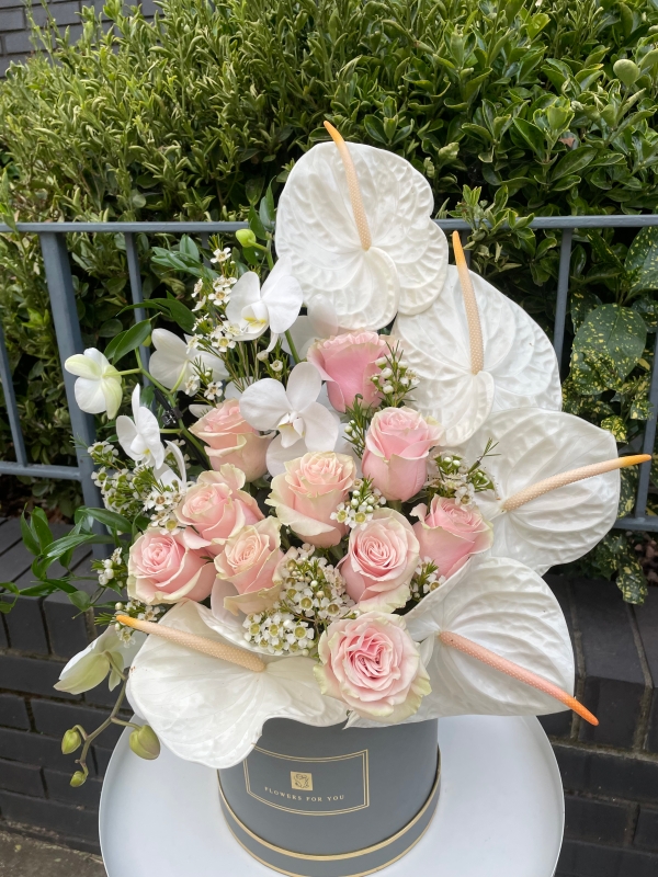 Beautiful hat box with wax flower, pink mondial roses, white orchid & anthurium