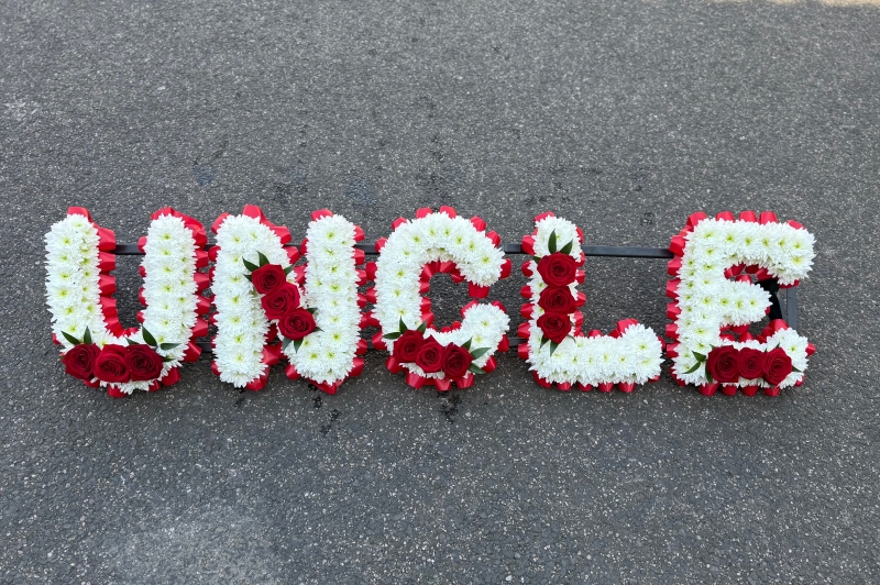 Based with fresh white chrysanthemums, finished with rich red roses and matching ribbon for a bold yet elegant look to honour someone special.